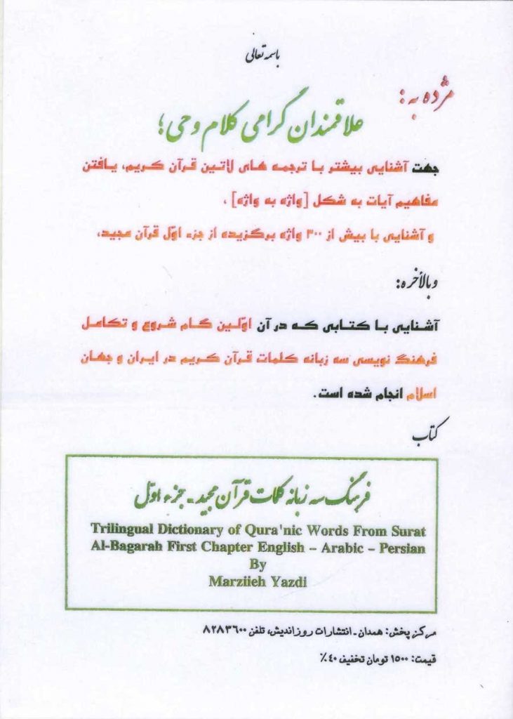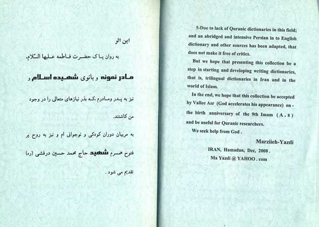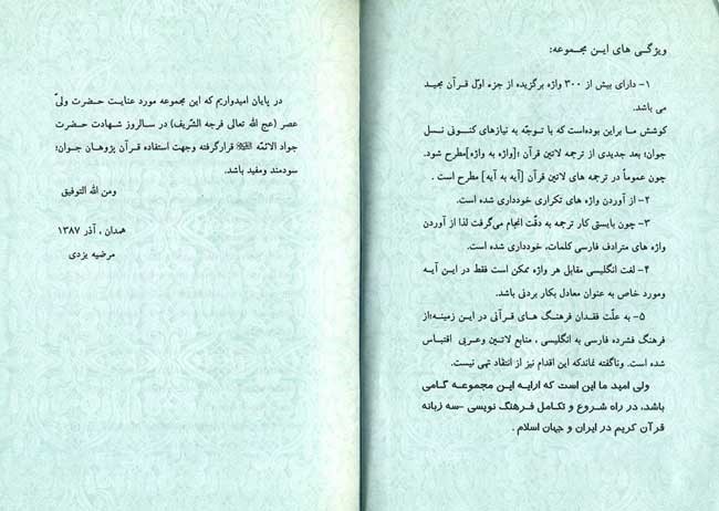 *امید است این مجموعه گامی باشد در راه شروع تکامل و فرهنگ نویسی سه زبانه کلمات قرآن کریم در ایران و جهان اسلام. |