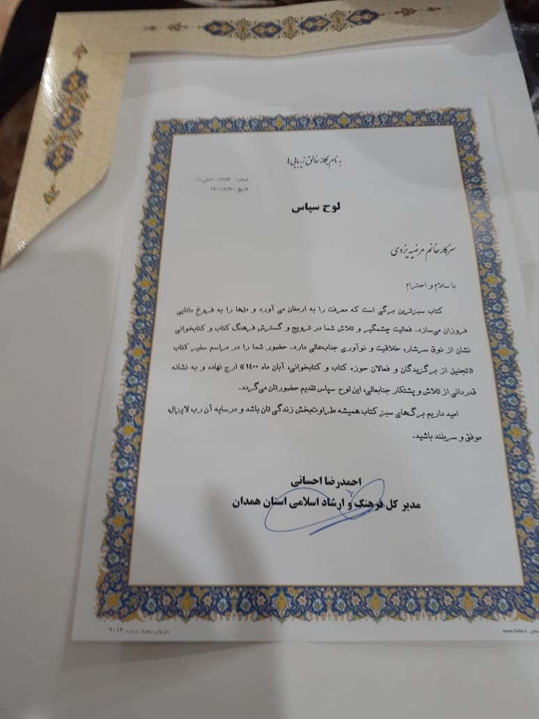 در مراسم بزرگداشت بیست و نهمین دوره هفته کتاب سال 1400 تحت عنوان “سفیر کتاب” در استان همدان که در تاریخ 27 آبان 1400 توسط سازمان فرهنگ و ارشاد اسلامی همدان برگزار گردید، سرکار خانم یزدی موفق به کسب رتبه اول نویسندگان ممتاز در حوزه نشر و نویسندگی استان همدان و همچنین به عنوان مولف، محقق ممتاز و پیشکسوت علوم قرآنی، در مراسم سال کتاب 1400 استان همدان تحت عنوان “سفیر کتاب ” برگزیده و تجلیل شدند.